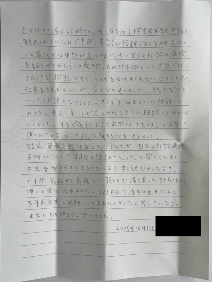 - 8月 1, 2025「365日仙台障害年金サポート」様のサポートのおかげです。