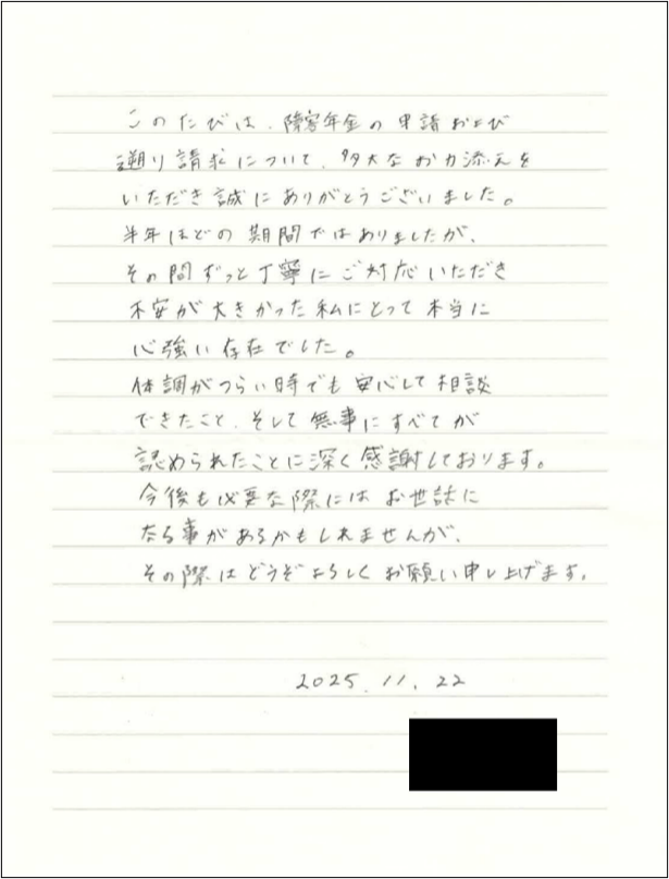 体調がつらい時でも安心して相談できたこと、そして無事にすべてが認められたことに深く感謝しております。