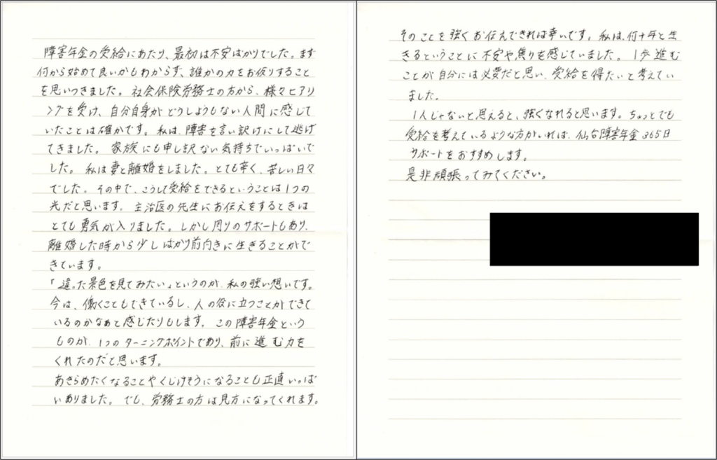 障害年金の受給にあたり、最初は不安ばかりでした。まず何から始めて良いかもわからず、誰かの力をお借りすることを思いつきました。社会保険労務士の方から、様々なヒアリングを受け、自分自身がどうしようもない人間に感じていたことは確かです。私は、障害を言い訳にして逃げてきました。家族にも申し訳ない気持ちでいっぱいでした。私は妻と離婚をしました。とても辛く、苦しい日々でした。その中で、こうして受給をできるということは1つの光だと思います。主治医の先生にお伝えをするときはとても勇気が入りました。しかし周りのサポートもあり、離婚した時から少しばかり前向きに生きることができています。