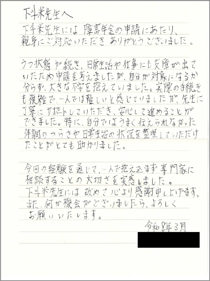 下斗米先生には障害年金の申請にあたり、親身にご対応いただきありがとうございました。